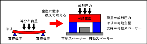 鋼材の成形圧力によるたわみ量はその鋼材の厚みと反比例するので金型設計の初期段階でその製品にバリが張ることなく成形できるだけの鋼材の必要な厚みを算出しておく必要がある。